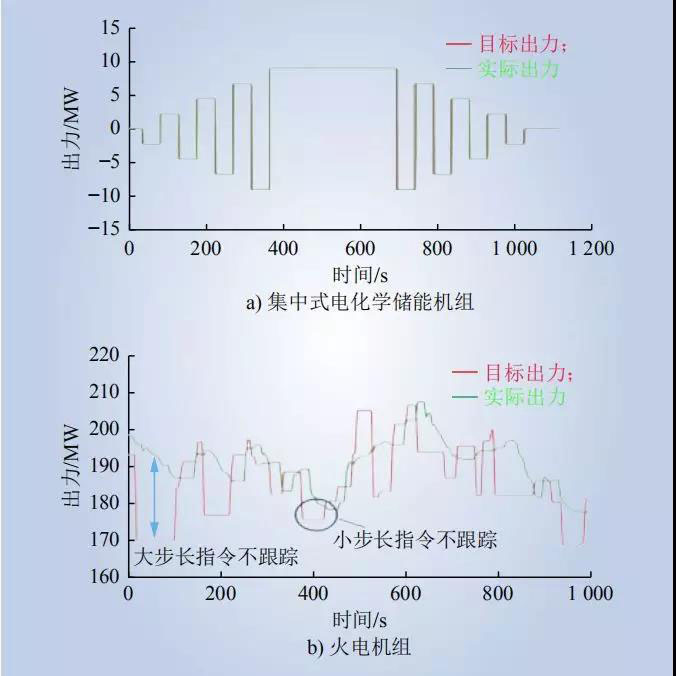 (1)研究儲能調(diào)節(jié)資源的控制特性,基于儲能與常規(guī)火電機組特性的對比如圖1所示??梢钥闯?,儲能出力響應(yīng)呈現(xiàn)階躍式變化,與火電機組幾十s至min級別的逐步爬升過程差異較大;儲能可以穩(wěn)定地保持在目標(biāo)功率出力,但火電機組的調(diào)節(jié)偏差比較明顯;儲能實際出力與給定出力曲線近乎相似重合,而傳統(tǒng)火電機組的調(diào)節(jié)曲線有明顯延遲和偏差。