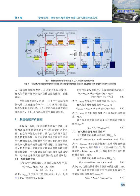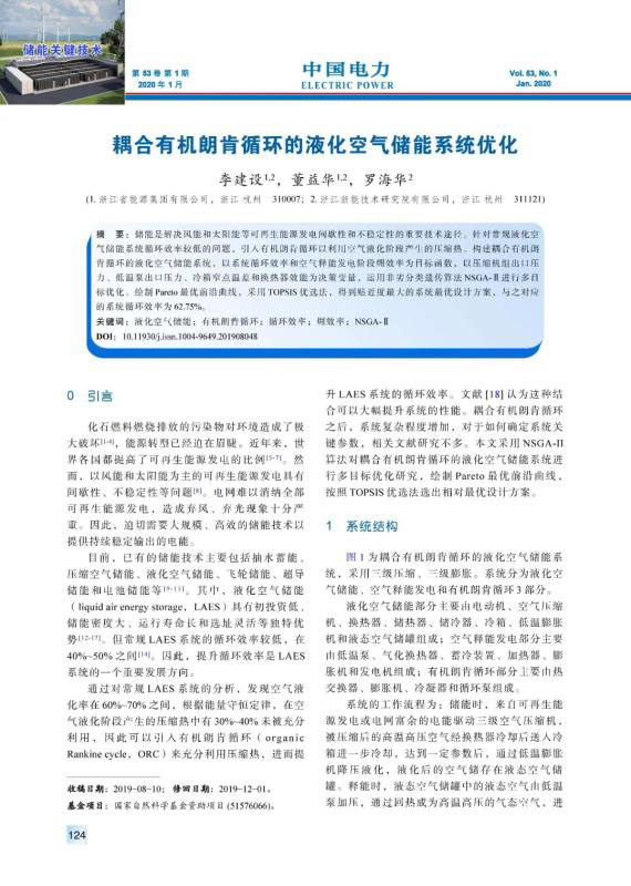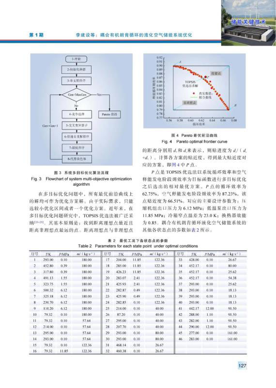 儲能是解決風(fēng)能和太陽能等可再生能源發(fā)電間歇性和不穩(wěn)定性的重要技術(shù)途徑。針對常規(guī)液化空氣儲能系統(tǒng)循環(huán)效率較低的問題,引入有機朗肯循環(huán)以利用空氣液化階段產(chǎn)生的壓縮熱。構(gòu)建耦合有機朗肯循環(huán)的液化空氣儲能系統(tǒng),以系統(tǒng)循環(huán)效率和空氣釋能發(fā)電階段?效率為目標(biāo)函數(shù),以壓縮機組出口壓力、低溫泵出口壓力、冷箱窄點溫差和換熱器效能為決策變量,運用非劣分類遺傳算法NSGA-Ⅱ進行多目標(biāo)優(yōu)化。繪制Pareto最優(yōu)前沿曲線,采用TOPSIS優(yōu)選法,得到貼近度最大的系統(tǒng)最優(yōu)設(shè)計方案,與之對應(yīng)的系統(tǒng)循環(huán)效率為62.75%。