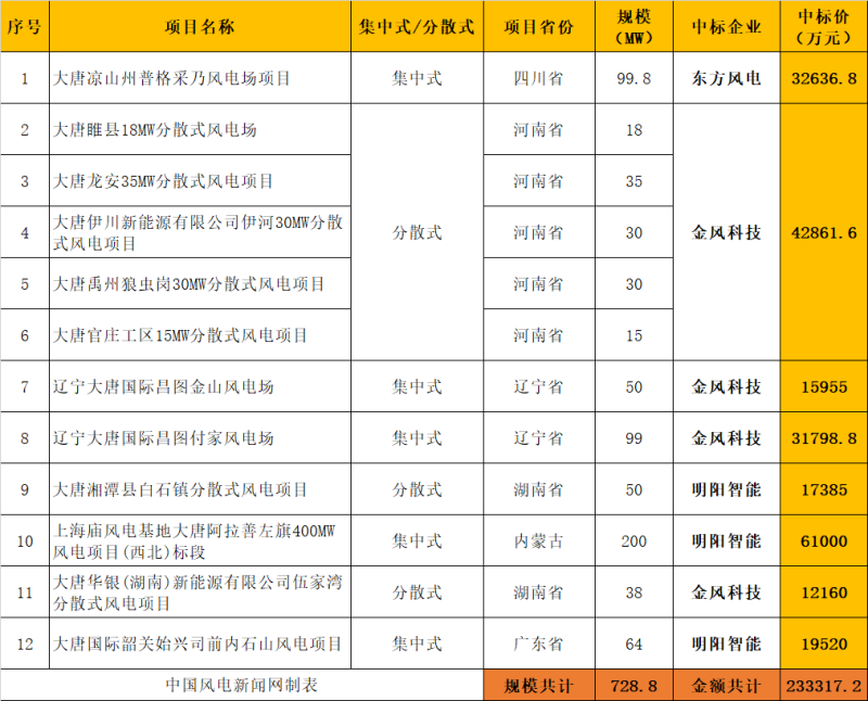 中國(guó)儲(chǔ)能網(wǎng)訊:12月8日,大唐集團(tuán)公布12個(gè)風(fēng)電項(xiàng)目機(jī)組采購(gòu)最終中標(biāo)結(jié)果,規(guī)模共計(jì)728.8MW,總價(jià)超23.3億元!其中:金風(fēng)科技中標(biāo)315MW,明陽智能中標(biāo)314MW,東方風(fēng)電中標(biāo)99.8MW。