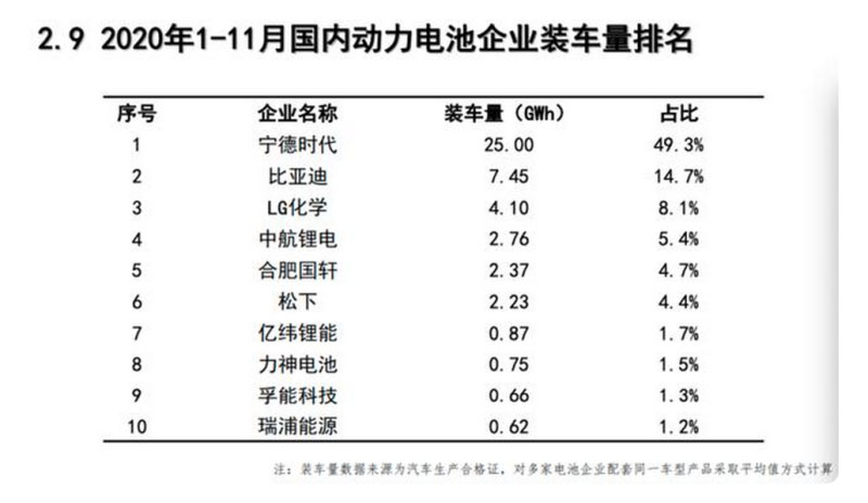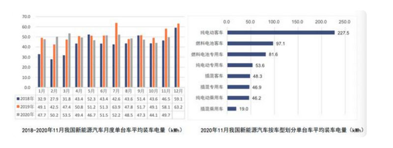 從單臺車平均裝車電量來看,2020年11月,我國新能源汽車按車型劃分的平均裝車電量49.7kWh,環(huán)比上升12.7%。其中純電動乘用車和純電動客車單車平均帶電量分別為46.2kWh/輛和227.5kWh/輛,環(huán)比分別上升9.2%和12.8%。