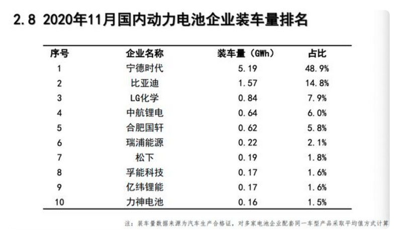 企業(yè)方面,11月,我國新能源汽車市場共計47家動力電池企業(yè)實現(xiàn)裝車配套,較10月份增加9家。排名前3家、前5家、前10家動力電池企業(yè)動力電池裝車量分別為7.6GWh、8.9GWh和9.8GWh,占總裝車量比分別為71.7%、83.5%和92.0%。