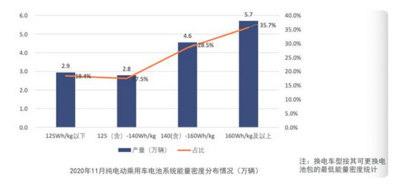 11月,我國純電動乘用車系統(tǒng)能量密度在140(含)-160Wh/kg和160Wh/kg及以上車型產(chǎn)量分別為4.6萬輛和4.7萬輛,占比分別為28.5%和35.7%,125Wh/kg以下車型產(chǎn)量2.9萬輛,占比18.4%,較10月份下降4.4個百分點。