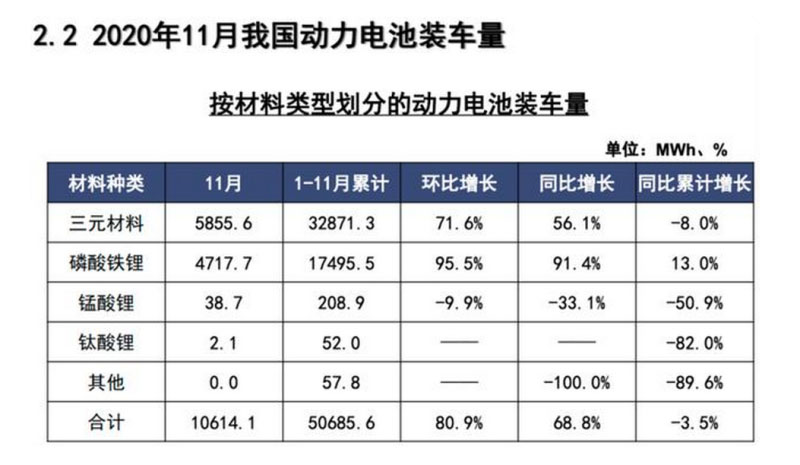 前11月,我國動力電池裝車量累計50.7GWh,同比累計下降3.5%。其中三元電池裝車量累計32.9GWh,占總裝車量64.9%,同比累計下降8.0%;磷酸鐵鋰電池裝車量累計17.5GWh,占總裝車量34.5%,同比累計增長13.0%,已超越去年同期水平。