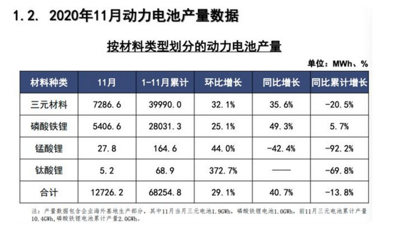 11月,我國動力電池產(chǎn)量共計12.7GWh,同比增長40.7%,環(huán)比增長29.1%。其中三元電池產(chǎn)量7.3GWh,占總產(chǎn)量57.3%,同比增長35.6%,環(huán)比增長32.1%;磷酸鐵鋰電池產(chǎn)量5.4GWh,占總產(chǎn)量42.5%,同比增長49.3%,環(huán)比增長25.1%。