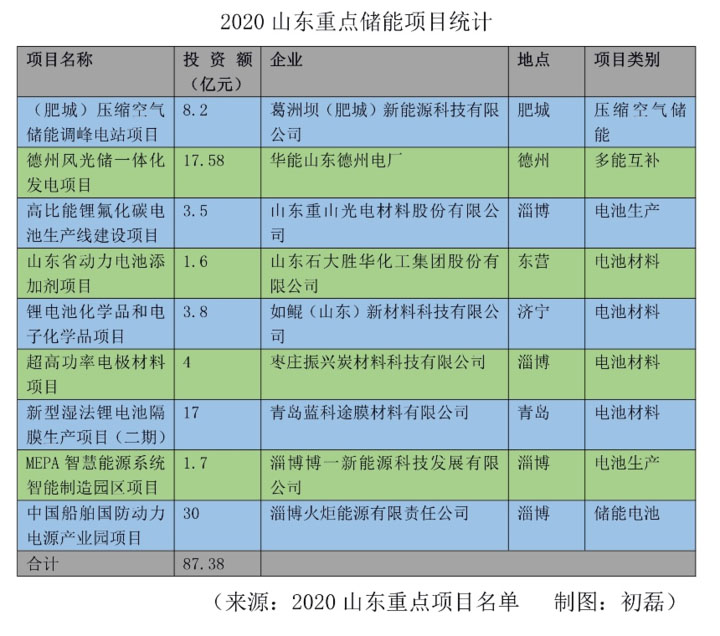 從項(xiàng)目布局看,今年山東重點(diǎn)建設(shè)項(xiàng)目中,儲能項(xiàng)目達(dá)9個(gè),總投資達(dá)87.38億元,分布于肥城、淄博、青島、德州、東營、濟(jì)寧等6市(縣),涉及多能互補(bǔ)、電池儲能等類別。
