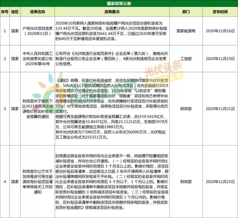 國家:出臺光伏相關新政策4條。國際能源網(wǎng)/光伏頭條關注到,11月,國家能源局發(fā)布《戶用光伏項目信息(2020年11月)》指出, 2020年10月新納入國家財政補貼規(guī)模戶用光伏項目總裝機容量為133.44萬千瓦。