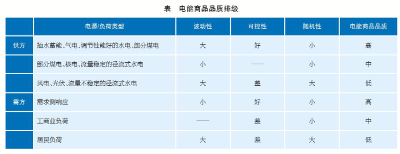 由于電能難以大量儲存,發(fā)用功率需要實(shí)時(shí)平衡,從對電力系統(tǒng)調(diào)度運(yùn)行和功率平衡的影響,筆者認(rèn)為電能商品品質(zhì)應(yīng)從(波動性、可控性、隨機(jī)性)3個(gè)維度進(jìn)行衡量(見表)。其中波動性指功率相對于自身容量的變化幅度;可控性指將功率在一定范圍內(nèi)自由調(diào)節(jié)的難易程度;隨機(jī)性與可控性有一定的關(guān)聯(lián),隨機(jī)性大的電源或負(fù)荷一定難于控制,而隨機(jī)性小的電源或負(fù)荷可能易控(可靈活調(diào)節(jié)的資源),也可能難控(功率相對固定的資源)。對當(dāng)前各類常見供方(電廠)所生產(chǎn)和需方(負(fù)荷)所消費(fèi)的電能商品品質(zhì)可以給出表中所示的排級。注意這里是對電能商品的品質(zhì)進(jìn)行排級,而非給電源或負(fù)荷“貼標(biāo)簽”,僅按一般情況依照電能商品品質(zhì)高低對電源和負(fù)荷進(jìn)行大致分類,而具體情況需要具體分析。例如,如果品質(zhì)一般的煤電經(jīng)過靈活性改造,可升級為高品質(zhì)的調(diào)峰電源。需要說明的是,電能商品品質(zhì)是從保證電力系統(tǒng)發(fā)用功率平衡的角度來定義的,因此對于電能商品的供方(生產(chǎn)者)和需方(消費(fèi)者),商品品質(zhì)的價(jià)值內(nèi)涵是不同的。從定價(jià)原則來講,對于供方,電能商品品質(zhì)越高,定價(jià)越高;對于需方,電能商品品質(zhì)越高,定價(jià)越低(即價(jià)格越優(yōu)惠),甚至可以享受負(fù)電價(jià)。也就是說,供方所生產(chǎn)的低品質(zhì)電能商品(如風(fēng)電)可以較低價(jià)提供需方的高品質(zhì)電能商品消費(fèi)(如需求側(cè)響應(yīng)),反之亦然。