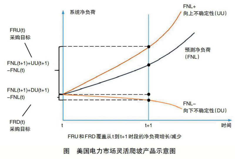 在美國加州電力市場(CAISO)和中部大陸電力市場(MISO),建立了靈活爬坡產(chǎn)品(Flexible Ramping Product)交易,取得了良好的效果。如圖所示,深藍(lán)色曲線表示預(yù)測凈負(fù)荷(FNL),即系統(tǒng)總負(fù)荷減去可再生能源發(fā)電出力。由于新能源功率預(yù)測的不確定性,取概率為95%的置信區(qū)間,最大預(yù)測凈負(fù)荷可增加至(FNL+),其中包括了向上不確定性UU;而最小預(yù)測凈負(fù)荷可減小至(FNL-),其中包括了向下不確定性DU。在第t時(shí)段采購靈活爬坡產(chǎn)品,要覆蓋從t到t+1時(shí)段的凈負(fù)荷增長/減少,則需采購的向上靈活爬坡產(chǎn)品為FRU(t)=FNL(t+1)+UU(t+1)-FNL(t),需采購的向下靈活爬坡產(chǎn)品為FRD(t)=FNL(t+1)+DU(t+1)-FNL(t)。靈活爬坡產(chǎn)品與能量(現(xiàn)貨)及備用聯(lián)合出清,與實(shí)時(shí)備用類似,基于機(jī)會成本確定出清價(jià)。