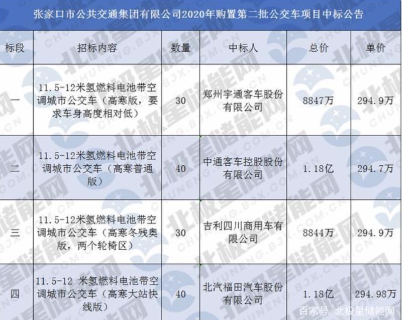 中國(guó)儲(chǔ)能網(wǎng)訊:12月14日,張家口市公共交通集團(tuán)有限公司公布了2020年購(gòu)置第二批公交車(chē)項(xiàng)目中標(biāo)公告,四個(gè)標(biāo)段共計(jì)140輛氫燃料電池公交車(chē),鄭州宇通、中通、吉利四川商用車(chē)、北汽福田分別獲得中標(biāo),中標(biāo)總價(jià)4.13億元。