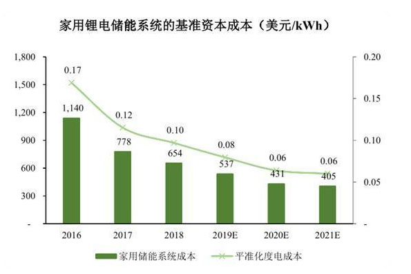 根據(jù)BNEF統(tǒng)計(jì),截至2018年,一套完整安裝的14kWh家用鋰電儲(chǔ)能系統(tǒng)的基準(zhǔn)資本成本為654美元/kWh,折算為平準(zhǔn)化度電成本約為0.1美元/kWh,較2016年下降約42.6%。BNEF預(yù)計(jì)到2021年該成本將下降至405美元/kWh,未來(lái)三年累計(jì)下降幅度為38.1%。
