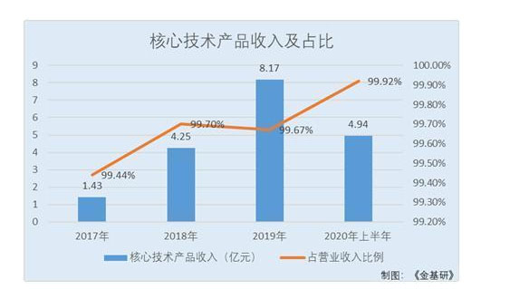 2017-2019年及2020年上半年,派能科技的核心技術(shù)產(chǎn)品收入分別為1.43億元、4.25億元、8.17億元、4.94億元,占當(dāng)期營(yíng)業(yè)收入的比例分別為99.44%、99.7%、99.67%、99.92%。