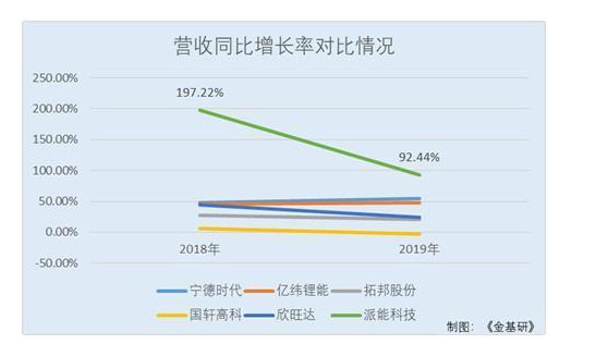 2018-2019年,同行業(yè)可比上市公司寧德時(shí)代新能源科技股份有限公司(以下簡(jiǎn)稱“寧德時(shí)代”),的營(yíng)業(yè)收入分別同比增長(zhǎng)48.08%和54.63%;惠州億緯鋰能股份有限公司(以下簡(jiǎn)稱“億緯鋰能”)的營(yíng)業(yè)收入分別同比增長(zhǎng)45.9%和47.35%;深圳拓邦股份有限公司(以下簡(jiǎn)稱“拓邦股份”)的營(yíng)業(yè)收入分別同比增長(zhǎng)26.99%和20.32%;國(guó)軒高科股份有限公司(以下簡(jiǎn)稱“國(guó)軒高科”)的營(yíng)業(yè)收入分別同比增長(zhǎng)5.97%和-3.28%;欣旺達(dá)電子股份有限公司(以下簡(jiǎn)稱“欣旺達(dá)”)的營(yíng)業(yè)收入分別同比增長(zhǎng)44.81%和24.1%。