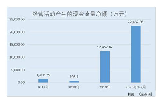 2017-2019年及2020年1-9月,派能科技經(jīng)營(yíng)活動(dòng)產(chǎn)生的現(xiàn)金流量?jī)纛~分別為-1,406.79萬(wàn)元,708.1萬(wàn)元、12,452.87萬(wàn)元、22,432.93萬(wàn)元。