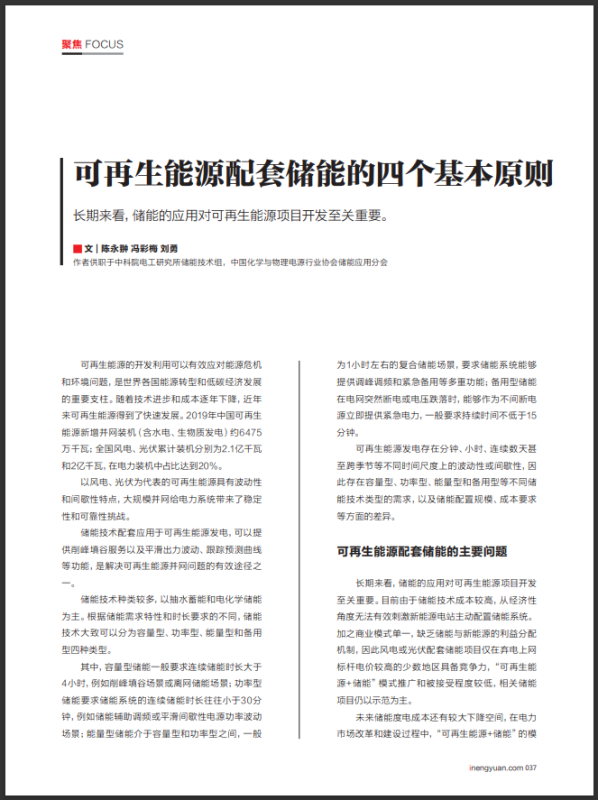 可再生能源發(fā)電在電力系統(tǒng)中的占比會(huì)持續(xù)增加,儲(chǔ)能系統(tǒng)的配置可以有效解決棄風(fēng)棄光及可再生能源并網(wǎng)帶來(lái)的電力系統(tǒng)穩(wěn)定性和靈活性問(wèn)題。目前儲(chǔ)能成本較高、收益模式尚不完善,可再生能源配套儲(chǔ)能尚處于初期探索階段。儲(chǔ)能系統(tǒng)在可再生能源發(fā)電中的應(yīng)用首先是解決波動(dòng)性問(wèn)題,未來(lái)成本下降后可進(jìn)一步解決可再生能源發(fā)電的間歇性問(wèn)題??稍偕茉磁涮變?chǔ)能的發(fā)展過(guò)程中,建議遵循上述四個(gè)基本原則,以避免盲目性和資源浪費(fèi),促進(jìn)儲(chǔ)能產(chǎn)業(yè)的健康發(fā)展。