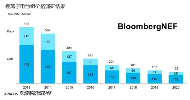 2010年到2020年間,全球鋰離子電池組平均價格從1100美元/千瓦時降至137美元/千瓦時,降幅達89%。根據(jù)彭博新能源財經(jīng)的最新預(yù)測,到2023年,鋰離子電池組平均價格將接近100美元/千瓦時。