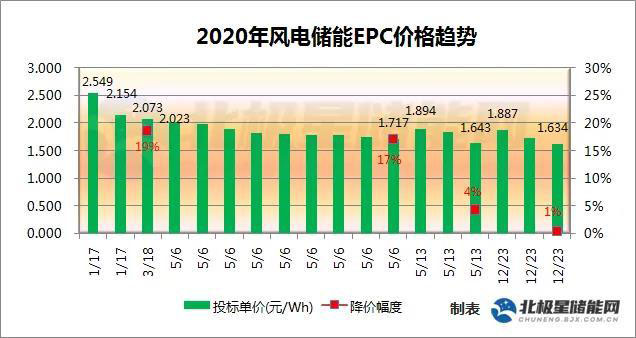 據(jù)北極星儲能網(wǎng)統(tǒng)計(jì),2020年截至目前共有五個(gè)風(fēng)電儲能項(xiàng)目公示中標(biāo)價(jià)格,風(fēng)電儲能中標(biāo)單價(jià)從1月份的最高2.549元/Wh、降至了目前最低1.634元/Wh,一年內(nèi)降幅達(dá)35.9%。