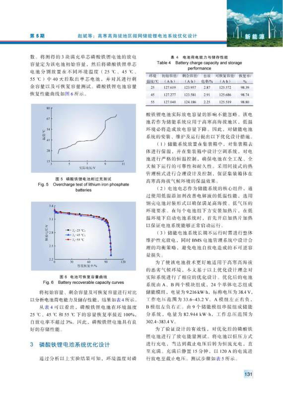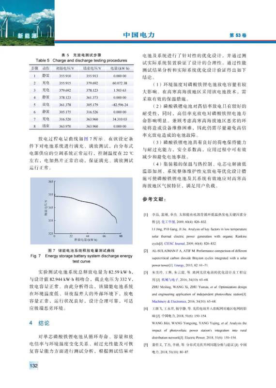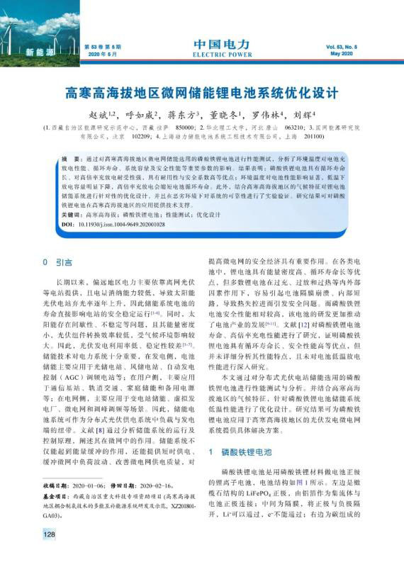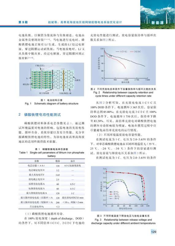 通過(guò)對(duì)高寒高海拔地區(qū)微電網(wǎng)儲(chǔ)能選用的磷酸鐵鋰電池進(jìn)行性能測(cè)試,分析了環(huán)境溫度對(duì)電池充放電性能、循環(huán)壽命、系統(tǒng)容量及安全性能等重要參數(shù)的影響。結(jié)果表明:磷酸鐵鋰電池具有循環(huán)壽命長(zhǎng)、對(duì)高倍率充放電耐受性強(qiáng),具有耐用性與安全系數(shù)高等優(yōu)點(diǎn);環(huán)境溫度對(duì)電池性能影響顯著,低溫下放電容量明顯下降,高倍率充放電會(huì)縮短電池循環(huán)壽命。此外,結(jié)合高寒高海拔地區(qū)的氣候特征對(duì)鋰電池儲(chǔ)能系統(tǒng)進(jìn)行針對(duì)性的優(yōu)化設(shè)計(jì),并且在惡劣環(huán)境下對(duì)系統(tǒng)的可靠性進(jìn)行了實(shí)驗(yàn)驗(yàn)證。研究結(jié)果可對(duì)磷酸鐵鋰電池在高寒高海拔地區(qū)的應(yīng)用提供技術(shù)支撐。