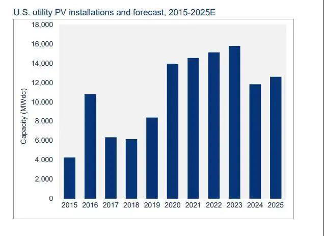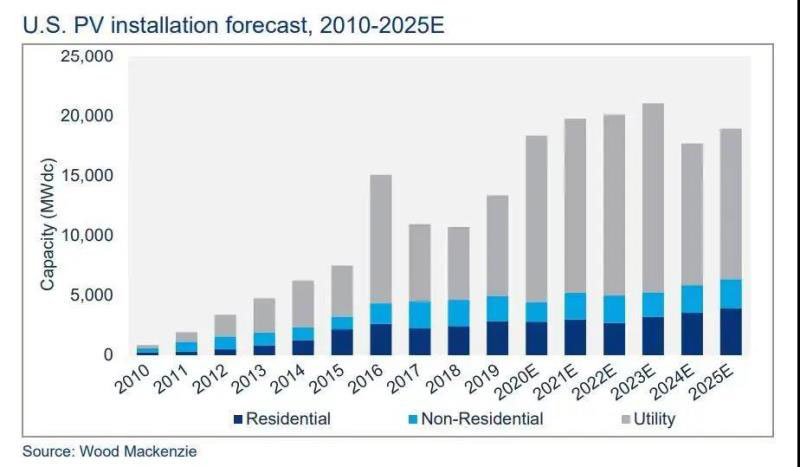 圖片:2021年美國(guó)新增光伏裝機(jī)將首次突破20GW。來(lái)源:Wood Mackenzie