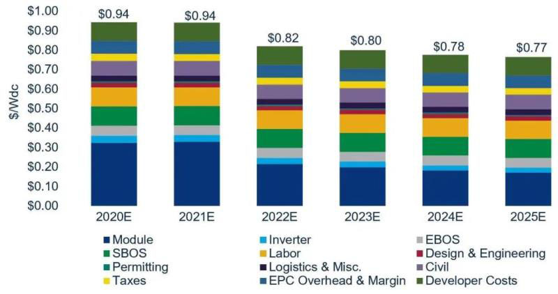 此外,從2019年到2020年,由于光伏組件價(jià)格持續(xù)壓低系統(tǒng)成本,光伏系統(tǒng)的所有細(xì)分市場(chǎng)的成本都有所下降。雖然2020年下半年玻璃等輔材漲價(jià)導(dǎo)致組件價(jià)格上漲,但是總趨勢(shì)還是同比下降的。根據(jù)Wood Mackenzie最近發(fā)布的《美國(guó)太陽(yáng)能光伏系統(tǒng)價(jià)格報(bào)告》,2020年100 MW公用設(shè)施規(guī)模的光伏系統(tǒng)平均成本為0.94美元/W,到2025年可能下降19%(所有數(shù)據(jù)均為直流側(cè))。尤其是2021至2022年,單瓦成本將下降13%。主要原因在于201關(guān)稅將逐步取消。