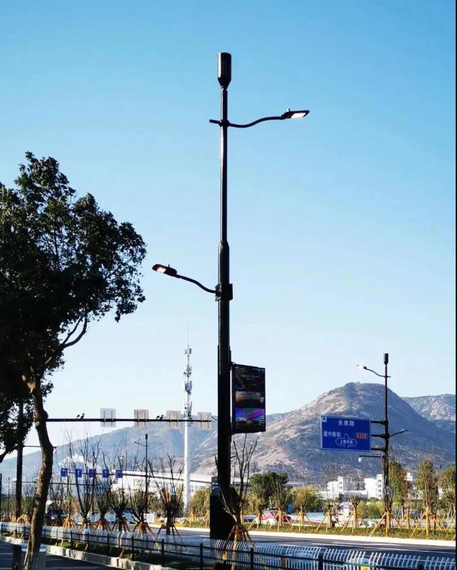 該路段智慧路燈還新增顯示屏,一塊塊豎式顯示屏,正播放著創(chuàng)新龍灣的宣傳片。整齊的桿燈在這條提升后的道路上格外醒目。與過去藍(lán)白色相間的燈桿不同,新安裝的路燈整體為黑色,下部為高2米的方形底座為集成智能配電箱。智慧路燈的配備使得該路段原來65個燈桿、8個通信桿、24個路牌桿24個信號燈和12個視頻監(jiān)控桿,最終基本集成到66根智慧燈桿上,總桿數(shù)縮減超5成,以往多桿林立的道路變得更加“清爽”。
