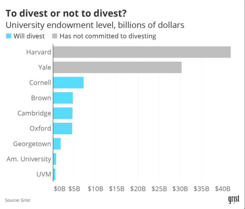 著名的學(xué)校如英國的牛津、劍橋大學(xué),美國的喬治敦、布朗、康奈爾大學(xué),加入了越來越多的大學(xué)計劃與向他們捐款的化石燃料公司剝離。美國最富有的兩所大學(xué),哈佛大學(xué)和耶魯大學(xué)的壓力越來越大,這兩所大學(xué)的捐贈總額達(dá)到720億美元。盡管這兩所學(xué)校都沒有承諾撤資,但哈佛大學(xué)宣布了一項仍然模糊的計劃,即到2050年將來自化石燃料公司的捐贈額降至零,并聲稱它將能夠與化石燃料公司合作實現(xiàn)這一目標(biāo)。