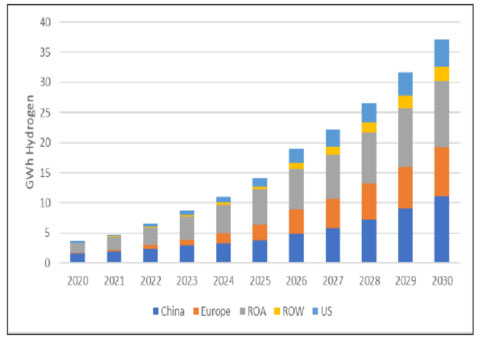 根據(jù)彭博社新能源財經公司對于燃料電池電動汽車的預測,圖52和53顯示了到2030年的預計部署量。到2030年,每年可以部署超過35GWh車載儲氫量。預計中國和亞洲其他國家將部署最多的車載儲氫量,而歐洲緊隨其后。燃料電池客車和輕型客車燃料電池電動汽車預計對車載儲氫有著更大需求。