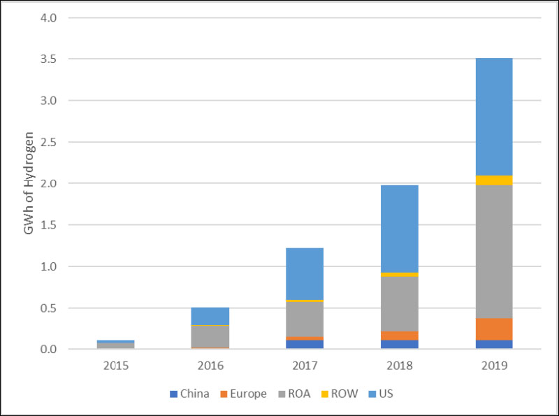 氫燃料電池電動汽車預計會增加,但目前只占新低碳汽車銷量的不到1%。全球約有三分之一的燃料電池電動汽在美國運營,其次是中國、日本和韓國。在未來10年中,盡管美國越來越重視將氫燃料電池用于中型和重型車輛,但燃料電池電動汽車的主要增長點預計在亞洲地區(qū)。