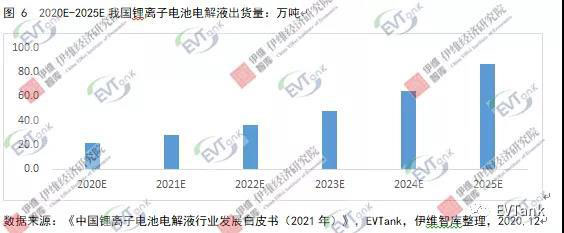 隨著下游新能源汽車動力電池需求增長、新興消費領域快速擴張以及“十四五”期間儲能產(chǎn)業(yè)爆發(fā),鋰電需求旺盛,帶動我國電解液出貨量在未來保持高速增長。預計到 2025年,我國電解液總體出貨量可達到 86.5 萬噸,年均增長速度約為31.7%,我國電解液總體市場規(guī)模將達到 197.8 億元,年均增長速度約為18.6%。
