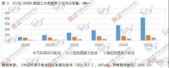 在汽車用動力電池領域,隨著新能源汽車滲透率逐步提升,預計到2025年,我國動力電池出貨量可達422.28GWh;在小型類鋰離子電池領域,可穿戴設備、無人機、小動力等新興消費領域將帶動小型類鋰離子電池出貨量增長,預計到2025年,我國小型類鋰離子電池出貨量為96.0GWh;在儲能用鋰離子電池領域,隨著電力體制改革推進、儲能成本降低以及鋰電替代鉛酸進程加速,預計到2025年,我國儲能電池出貨量可達60.0GWh。