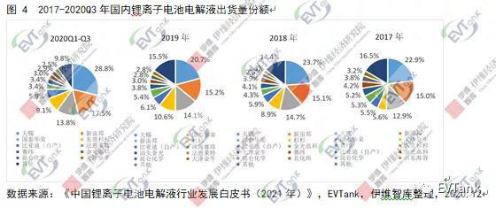 電解液的核心壁壘是保供能力,頭部企業(yè)憑借規(guī)模、成本、研發(fā)能力等優(yōu)勢,市場份額持續(xù)增長,行業(yè)集中度進一步提升,2017年-2020Q3前四名企業(yè)合計市占率分別為56.4%、62.4%、60.6%和69.1%。2020Q3前十名企業(yè)合計市占率超過90%,龍頭企業(yè)不同產(chǎn)品分配較均衡,市場格局基本穩(wěn)定,其中天賜材料憑借其產(chǎn)業(yè)鏈布局完善、成本控制能力強、定制化能力突出及客戶壁壘較高等優(yōu)勢,龍頭地位穩(wěn)固;新宙邦、國泰華容、杉杉等第一梯隊企業(yè)增量明顯;比亞迪、法恩萊特、珠海賽緯和金光高科等第二梯隊企業(yè)市場份額也在逐步提升。具體來看,天賜材料穩(wěn)居第一,市場份額達到 28.8%;新宙邦排名第二,市場份額為 17.5%;國泰華榮排名第三,市場份額為 13.8%;東莞杉杉排名第四,市場份額為9.1%。