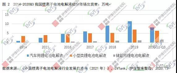 電解液屬于鋰電四大材料之一,是鋰離子電池的血液,在保障鋰離子電池的安全性、長循環(huán)等性能方面至關重要。目前,電解液已基本實現(xiàn)國產(chǎn)化,其出貨量與鋰離子電池出貨量成正比。2020年初受疫情影響,鋰電池需求低迷、開工率低,隨著二季度國內疫情控制后有序復工復產(chǎn),國內經(jīng)濟復蘇超預期,鋰電池需求增長帶動電解液出貨量回升,截止2020Q3,我國鋰離子電池電解液出貨量為16.1萬噸,近六年年均增長速度為34.5%,其中,汽車用動力電池電解液出貨量為8.2萬噸,小型類鋰離子電池電解液出貨量為6.3萬噸,儲能用鋰離子電池電解液出貨量為1.6萬噸。