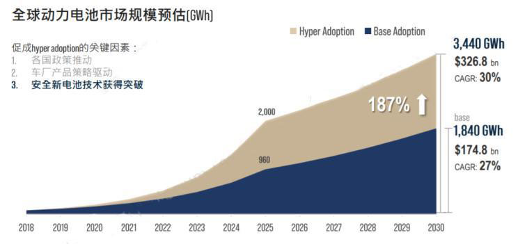 全球來看,有行業(yè)機(jī)構(gòu)預(yù)估,如果能克服動(dòng)力電池安全、續(xù)航方面的問題,到2030年,動(dòng)力電池產(chǎn)業(yè)規(guī)??稍诒J禺a(chǎn)值1840GWh的基礎(chǔ)上再提升187%。