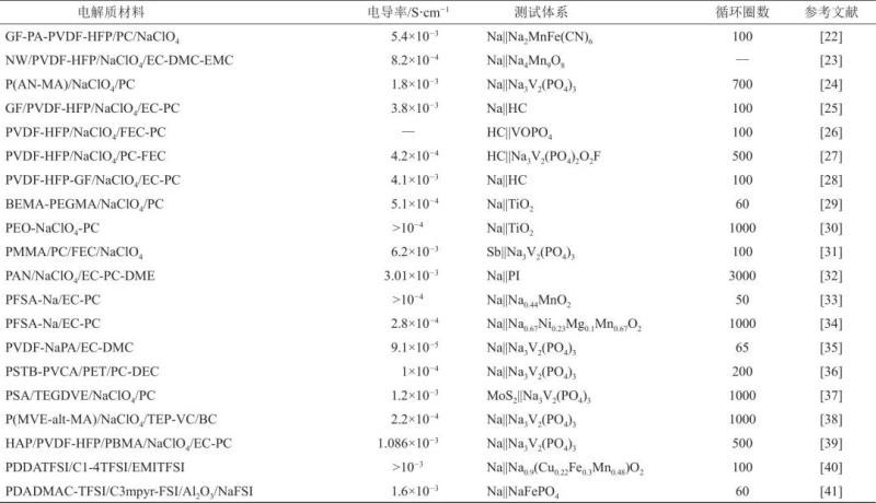 表2對比了凝膠電解質(zhì)的離子電導率及其在不同體系的鈉離子電池中的循環(huán)圈數(shù)。可以看出凝膠電解質(zhì)體系的離子電導率多數(shù)在10-3~10-4 S/cm數(shù)量級,與電解液/商業(yè)隔膜體系相當,體現(xiàn)出室溫鈉離子電池應用潛力。需要注意的是聚合物凝膠電解質(zhì)依賴基底與溶劑的分子間力達到束縛有機溶劑的目的,然而該作用力較弱,有機溶劑仍有揮發(fā)可能,導致材料的結(jié)構(gòu)不穩(wěn)定。同時不同聚合物骨架、溶劑分子與電極間的界面演變更為復雜,SEI膜的結(jié)構(gòu)對性能的影響缺乏深入的表征與系統(tǒng)的認識,亟需進一步研究。
