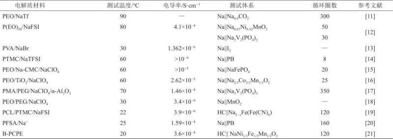 表1對比了報道的聚合物固態(tài)電解質(zhì)的不同測試溫度、電導率、循環(huán)圈數(shù)數(shù)據(jù)。由于聚合物固態(tài)電解質(zhì)在電池循環(huán)中存在復雜的界面演變機制,因此將電池的工作圈數(shù)納入考慮的重要指標??梢钥闯鲭S著研究的開展,較為成熟的鈉離子電池正負極與聚合物固態(tài)電解質(zhì)的搭配體現(xiàn)出一定的應用潛力。同時,通過改變鹽濃度、摻雜分子量較小的低聚物等方法發(fā)展具有更低的玻璃化溫度的聚合物電解質(zhì),通過分子設計改變離子在聚合物框架中的傳輸機制等方式,研究者正在實現(xiàn)裝配的全固態(tài)鈉離子電池從中溫90 ℃逐步向室溫甚至零下低溫環(huán)境中的應用發(fā)展。