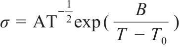 向聚合物固態(tài)電解質(zhì)中引入溶劑分子為離子提供強的分子極化作用,形成聚合物凝膠電解質(zhì),有效地提高了其離子電導率。Hashmi等使用離子液體EMITf浸潤含有0.5 mol/L NaCF3SO3(NaTf)的聚(偏二氟乙烯-co-六氟丙烯)(PVDF-HFP)制備凝膠電解質(zhì),發(fā)現(xiàn)室溫電導率高達5.74×10-3 S/cm?;谑?2)所描述的玻璃化溫度附近的Vogel-Tammann-Fulcher模型研究了聚合物的自由體積對帶電離子輸運的動力學過程影響。采用了基于交流-直流技術(shù)的Evans方法[9],通過式(3)