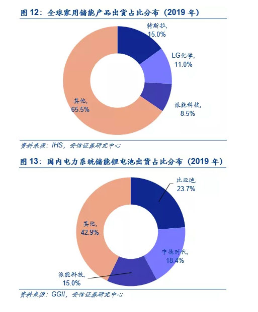 行業(yè)競爭格局相對分散,以鋰電大廠為主,細分賽道存在獨立第三方企業(yè)。從目前電力系統(tǒng)用電化學儲能出貨量占比數(shù)據(jù)看,行業(yè)競爭格局顯得較為分散且行業(yè)內(nèi)仍以鋰電大廠為主。其中,全球范圍主要是特斯拉、LG化學以及三星SDI等鋰電大廠,2019年全球家用儲能產(chǎn)品出貨前三名分別為特斯拉、LG化學和派能科技,占比分別為15%、11%和8.5%,CR3僅為34.5%;2019年國內(nèi)電力系統(tǒng)儲能鋰電池出貨量前三名分別為比亞迪、寧德時代和派能科技,占比分別為23.7%、18.4%和15%,CR3為57.1%。