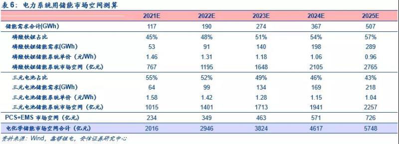 1)根據(jù)2.1測算,2021-2025年電力系統(tǒng)用儲能裝機需求分別為117、190、274、367和507GWh,需求年平均增速約為83.34%。磷酸鐵鋰鋰電池占比預計將從2021年的45%提升至2025年的57%;
