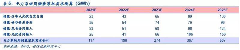 ■成長空間:發(fā)、用兩端齊頭并進,千億級別市場冉冉升起。在綜合考慮了發(fā)電側(cè)(平滑集中式光伏、風電出力)以及用電側(cè)(分布式光伏自發(fā)自用、峰谷價差套利)等領(lǐng)域后,根據(jù)我們測算, 2021-2025年電力系統(tǒng)用儲能裝機需求分別為117、190、274、367和507GWh,需求年平均增速約為83.34%。