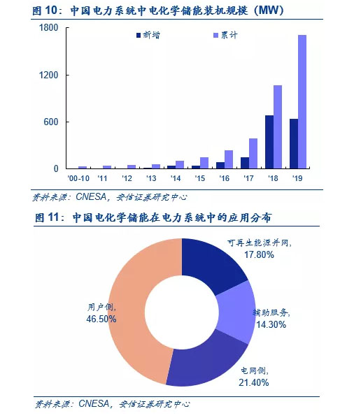 從應用分布來看,用戶側(cè)電化學儲能是主要應用領(lǐng)域,占比約46.5%。截至 2018 年,從中國累計投運的電化學儲能項目的應用分布上看,用戶側(cè)領(lǐng)域的裝機規(guī)模最大,為 470.4MW,占比 46.5%;電網(wǎng)側(cè)和集中式可再生能源并網(wǎng)分列二、三位,分別占比 21.4%和 17.8%。2018年,從中國新增投運的電化學儲能項目的應用分布上看,依然是用戶側(cè)領(lǐng)域的裝機規(guī)模最大,為 293.3MW,占比 42.9%,同比增長 312.5%,電網(wǎng)側(cè)、輔助服務和集中式可再生能源并網(wǎng)分列二至四位。