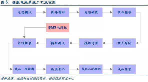 儲能電池系統(tǒng)由電芯和電池管理系統(tǒng)組成。儲能電池系統(tǒng)的生產(chǎn)工藝流程一般分為兩個工段。在電池模組生產(chǎn)工段,經(jīng)檢驗合格的電芯經(jīng)過極耳裁切、電芯插裝、極耳整形、激光焊接、模組封裝等工序組裝為電池模組;在系統(tǒng)組裝工段,經(jīng)檢驗合格的電池模組與 BMS 電路板等組裝成系統(tǒng)成品,然后經(jīng)一次檢測、高溫老化和二次檢測等工序后進入成品包裝環(huán)節(jié)。