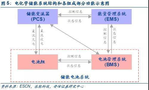 完整的電化學儲能系統(tǒng)主要由電池組、電池管理系統(tǒng)(BMS)、能量管理系統(tǒng)(EMS)、儲能變流器(PCS)以及其他電氣設備構(gòu)成。其中,電池組是儲能系統(tǒng)最主要的構(gòu)成部分;電池管理系統(tǒng)(BMS)主要負責電池的監(jiān)測、評估、保護以及均衡等;能量管理系統(tǒng)(EMS)負責數(shù)據(jù)采集、網(wǎng)絡監(jiān)控和能量調(diào)度等;儲能變流器可以控制儲能電池組的充電和放電過程,進行交直流的變換。