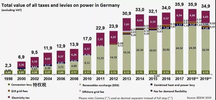 雖然德國的可再生能源發(fā)電發(fā)展迅速,但這也是有代價的。政府通過補貼使廉價的可再生能源在電力市場中優(yōu)先競價出清,從而壓低了現(xiàn)貨市場的電價。對于部分在批發(fā)市場中直接購電的高能耗大型工廠來說,這減少了他們的電費支出,使其受益。然而,對于無法以批發(fā)價在現(xiàn)貨市場購電的家庭或小型企業(yè)來說,大量可再生能源實際上推高了他們的電價。這是因為政府實際上是通過在終端居民賬單中加征可再生能源稅,網(wǎng)絡費用等來向風電場和光伏電站提供資金補貼,這些費用甚至能占到總電價的三分之二。下圖說明了近20年來德國電價和各種稅收的增長。