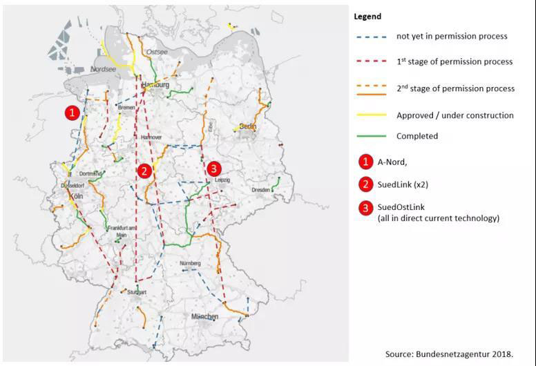 對此,德國政府和電網(wǎng)運營商已經(jīng)開始加快建設更多的南北輸電線,見上圖。根據(jù)聯(lián)邦網(wǎng)絡局的數(shù)據(jù),2025年之前,預計將有4650公里的新電線建成,另有約3050公里的電力線被翻新。雖然鋪設新線路涉及到土地,居民等方方面面的協(xié)調(diào)管理,但若不加快輸電線的建設以減少南北能源消費和生產(chǎn)的不平衡情況,這一問題可能會成為德國當前目標達成的向100%可再生能源發(fā)電的最大阻礙因素。
