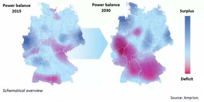 按照Amprion電網(wǎng)公司針對2015年與2030年情景所做電力平衡,未來十年后德國南部電力緊缺,北部電力盈余(南缺北豐現(xiàn)象),然而,目前連接德國南北部35,000公里的直流輸電線并不能完全承擔將北部的剩余發(fā)電傳至南部的任務。特別是在大風天,北部的現(xiàn)貨電力市場中有大量廉價的可再生能源參與競價,大大壓低電力批發(fā)價格,鼓勵南部用戶購電,然而現(xiàn)有的輸電線卻無法將這些風能全部輸送給客戶。因此,雖然北部發(fā)電中心可以在一定程度上通過靈活性調(diào)節(jié)和出口避免浪費風電,但南部電網(wǎng)運營商仍需調(diào)度價格較高的常規(guī)能源機組進行發(fā)電,從而提高了饋電成本。此外,由于各個北歐國家都在擴大風光發(fā)電能力,并且所有市場的用戶行為都表現(xiàn)出很大的相似性,因此調(diào)整進出口以滿足德國電力市場穩(wěn)定性的能力將會越來越有限。這就使得南北輸電線的建設更有必要。