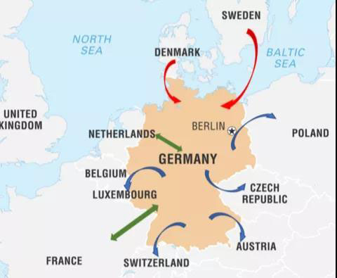 德國與周邊國家電力潮流交換圖