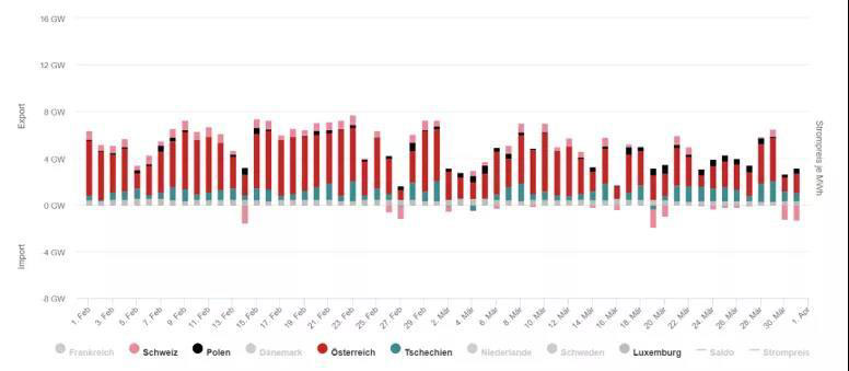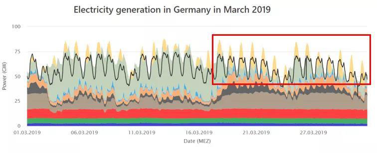 三月太陽能發(fā)電量開始逐漸變高,風電則開始減少。值得注意的是,三月下旬受新冠疫情的影響,全德經(jīng)濟活動受到一定抑制,總負荷曲線開始整體下調(diào)。3月22日正午12:30時,在負荷僅有53.13GW的情況下,僅光伏發(fā)電便達到了33.41GW,風電則為20. 73GW。雖然由于基礎(chǔ)負荷無法繼續(xù)向下調(diào)節(jié)容量以消納所有風光發(fā)電,因此存在一部分電力出口,但該時段可再生能源發(fā)電量達到了總用電消費的83.7%。