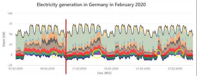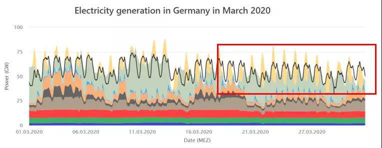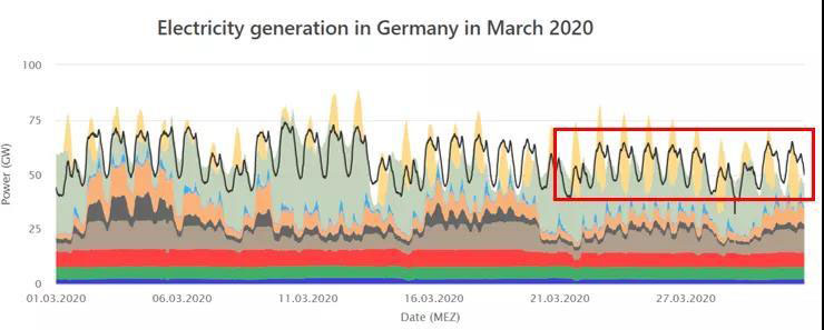 德國能源和水行業(yè)協(xié)會(BDEW)和巴登-符騰堡州太陽能與氫能研究中心都對德國第一季度的可再生能源發(fā)電占比進行了測算,均認同二、三月天晴風大的氣候因素和疫情導致的用電需求下降使得可再生能源發(fā)電占比快速增加。根據(jù)BDEW的測算結(jié)果,德國在2020年第一季度的總用電量(與2019年同期)下降2%,而總發(fā)電量卻同比下降了近7%。這其中核能和化石燃料發(fā)電減少了15%,風力發(fā)電量卻激增20%。綜合這些因素,使得可再生能源達到總發(fā)電量的52%。我們可以通過比較2019年和2020年2,3月的負荷曲線看出這點。