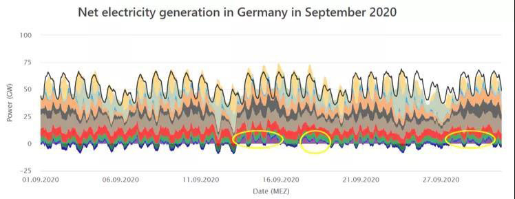 七、八月德國的光照資源仍十分優(yōu)越,由于總負荷還沒有回到正常范圍,許多天可再生能源與化石燃料發(fā)電量之和都超過了德國的總負荷量,得益于多年來發(fā)展的較好跨國電力通道建設,多余的電力通過跨國輸電網(wǎng)出口至其他歐洲國家, 共同消納。