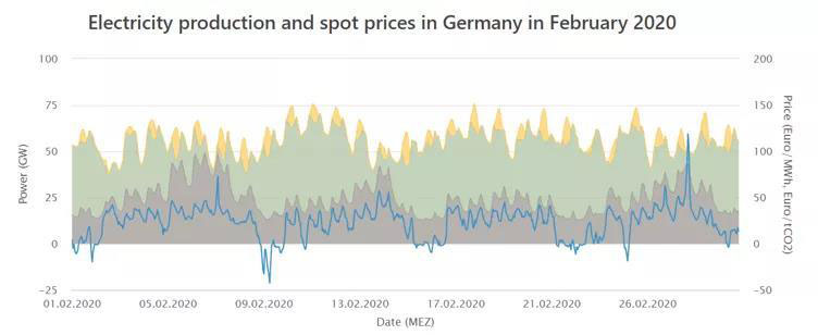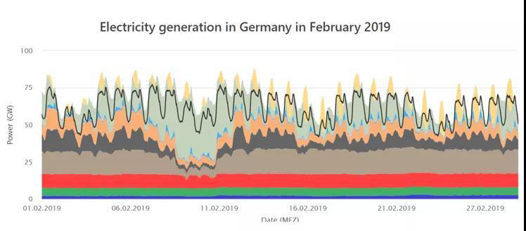 二月光照依然不充沛,但風力發(fā)電量卻顯著上升,在2月22日達到了峰值46.88GW的發(fā)電量。2月1號是周六,因此第一天的負荷量就相對較低。整體看來,工作日與周末的總負荷明顯不同,這樣的需求側(cè)與電源側(cè)均為高波動性情況下,德國高比例新能源電力系統(tǒng)如何打破能源不可能三角,長期維持電網(wǎng)安全穩(wěn)定運行、高可靠性和低棄電率,值得深度分析研究。
