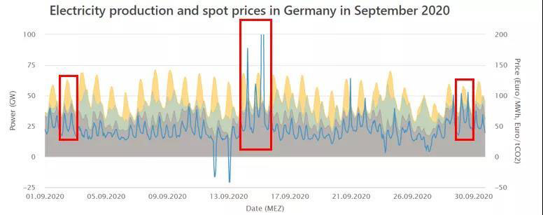 圖中的藍色曲線代表每日的電價(右y軸),黃色和綠色色塊分別代表光伏、風電出力,淺棕色色塊則是化石能源與核能(以下統(tǒng)稱常規(guī)能源)的發(fā)電量??梢钥闯?,九月雖然風電出力較小,但光照資源較為優(yōu)越,因此電價曲線在一天內(nèi)有非常明顯的峰谷差,最高位和最低位現(xiàn)貨市場出清價格平均相差約20~30歐元/MWh–正午光電出力最高時電價非常低,早晚風光發(fā)電都較弱時電價又會暴漲。燃煤、燃氣機組的出力曲線因此與電價曲線的形狀十分相似,且能看出電價曲線一般會略先于基礎(chǔ)能源發(fā)電曲線,說明現(xiàn)貨市場的價格變化有效激勵了這些常規(guī)電源的靈活出力和調(diào)峰。9月12~13日的周末,由于整體負荷較低,光伏出力又比較高,現(xiàn)貨市場甚至還出現(xiàn)了負電價。這是可再生能源大發(fā)情況下常出現(xiàn)的一種現(xiàn)象,意味著當常規(guī)電源壓至最低出力仍不能消納所有可再生能源發(fā)電后,電力公司會向用戶支付一定的費用讓他們開啟家中的電力設備以消耗多余的發(fā)電,以避免導致電網(wǎng)阻塞和重載超載現(xiàn)象發(fā)生。